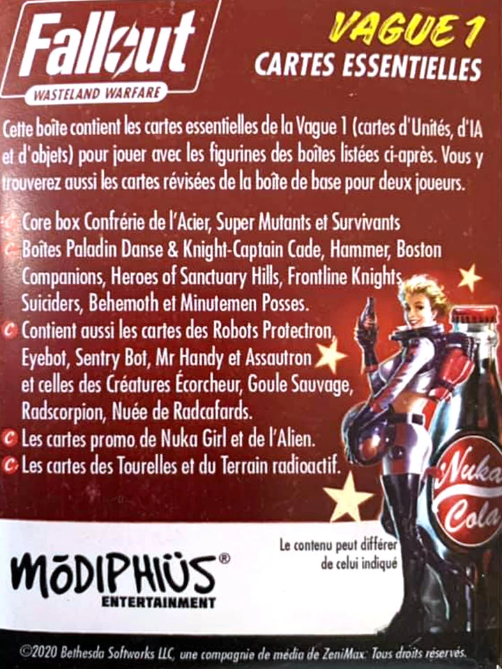 Cette boîte de Fallout : Wasteland Warfare : Cartes Essentielles – Vague 1 renferme pas moins de 150 cartes en Français afin de francisé toute la vague 1 (cartes d’unités, d’IA et objets) de Fallout : Wasteland Warfare, vous y trouverez aussi les cartes révisées de la boîte de base pour 2 joueurs.