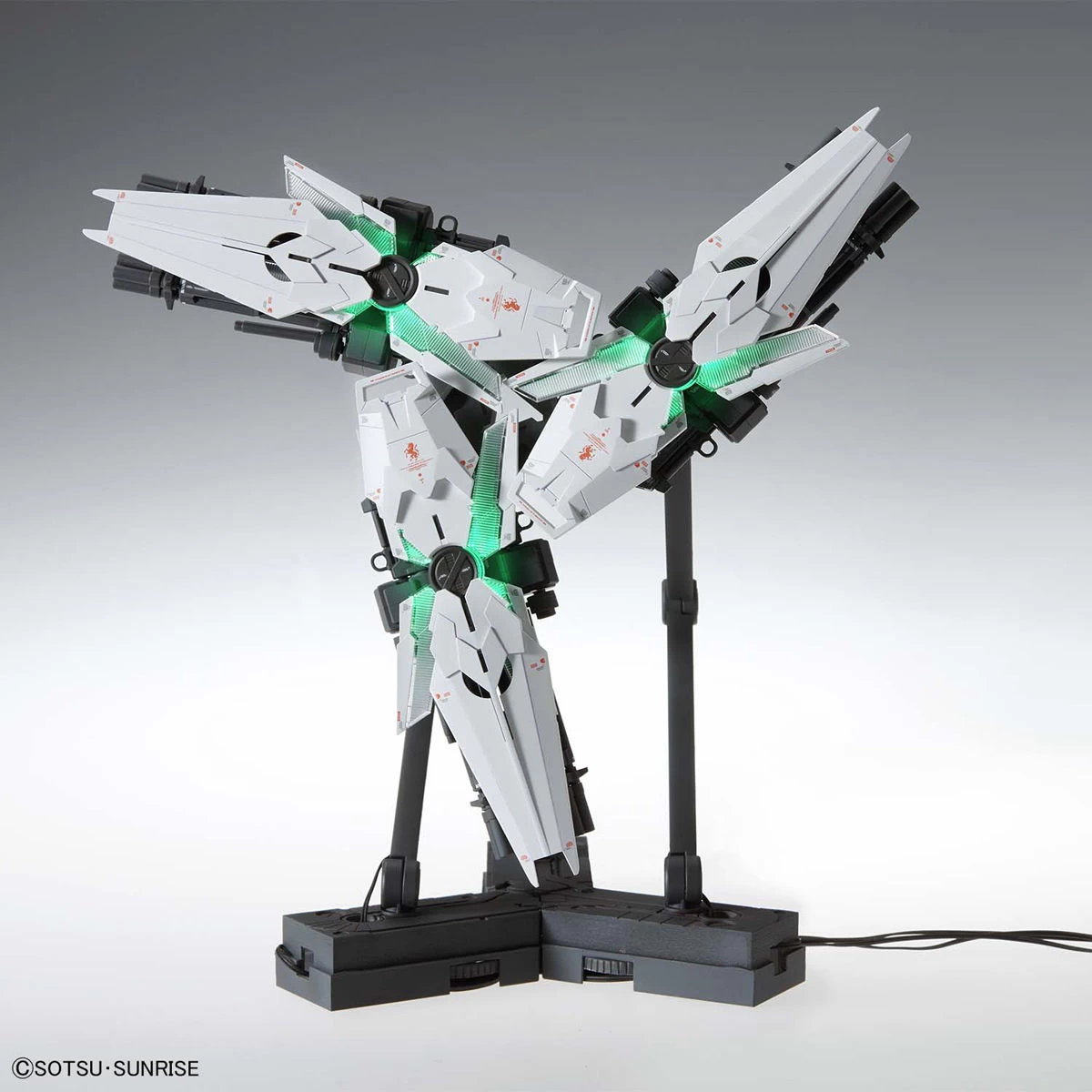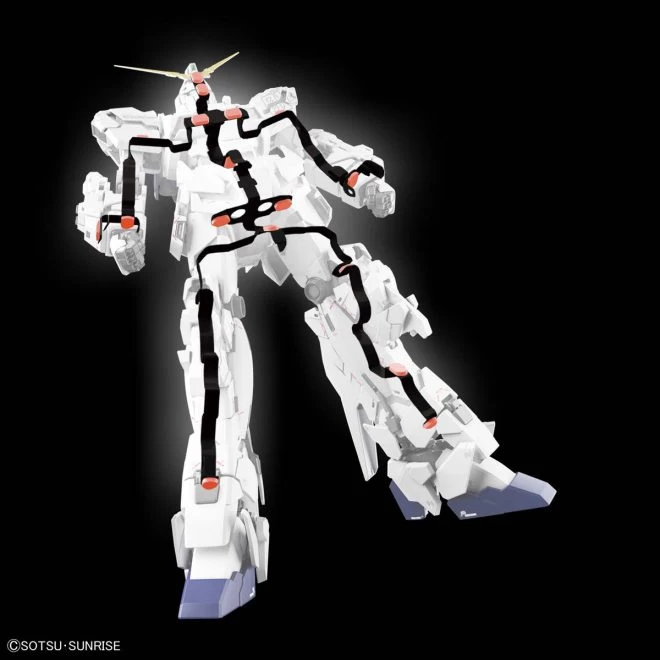 Le kit est également complété par une sélection étonnante d’équipements originaux de Unicorn Gundam qui permettent aux modélisateurs de basculer entre la version normale et la version de combat finale. L’émission de lumière fournit également un éclairage rouge et vert réfléchi sur son cadre psycho blanc clair.